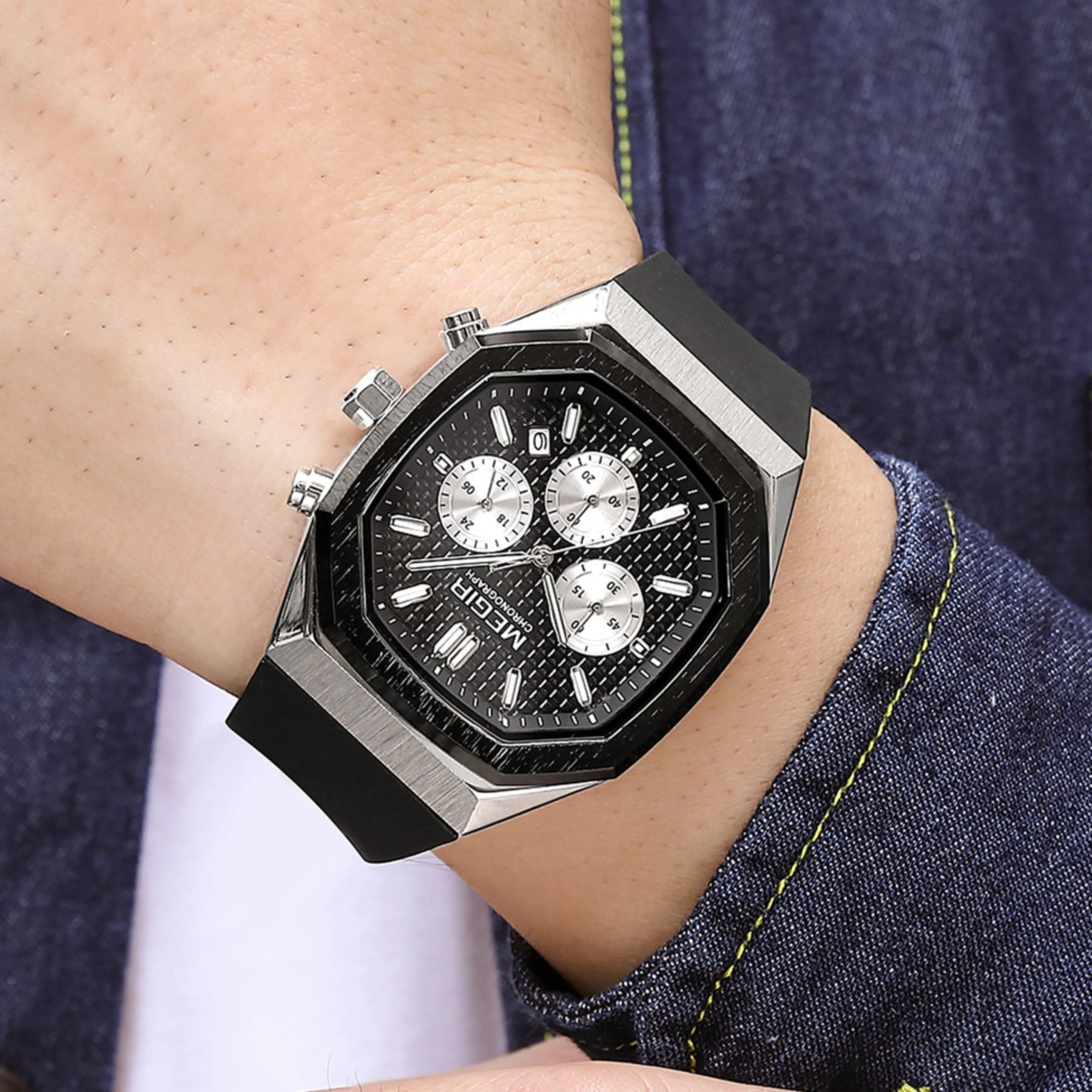Pair large text with a full-width image to draw attention to an important detail of your brand or product line.